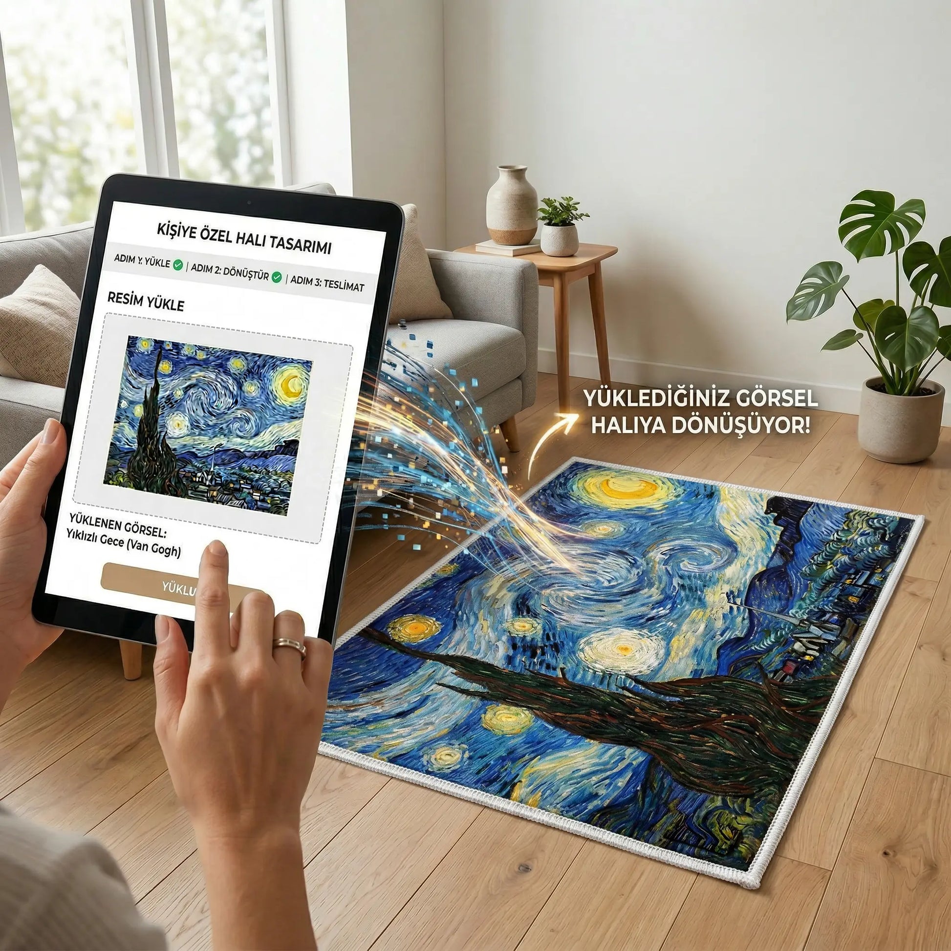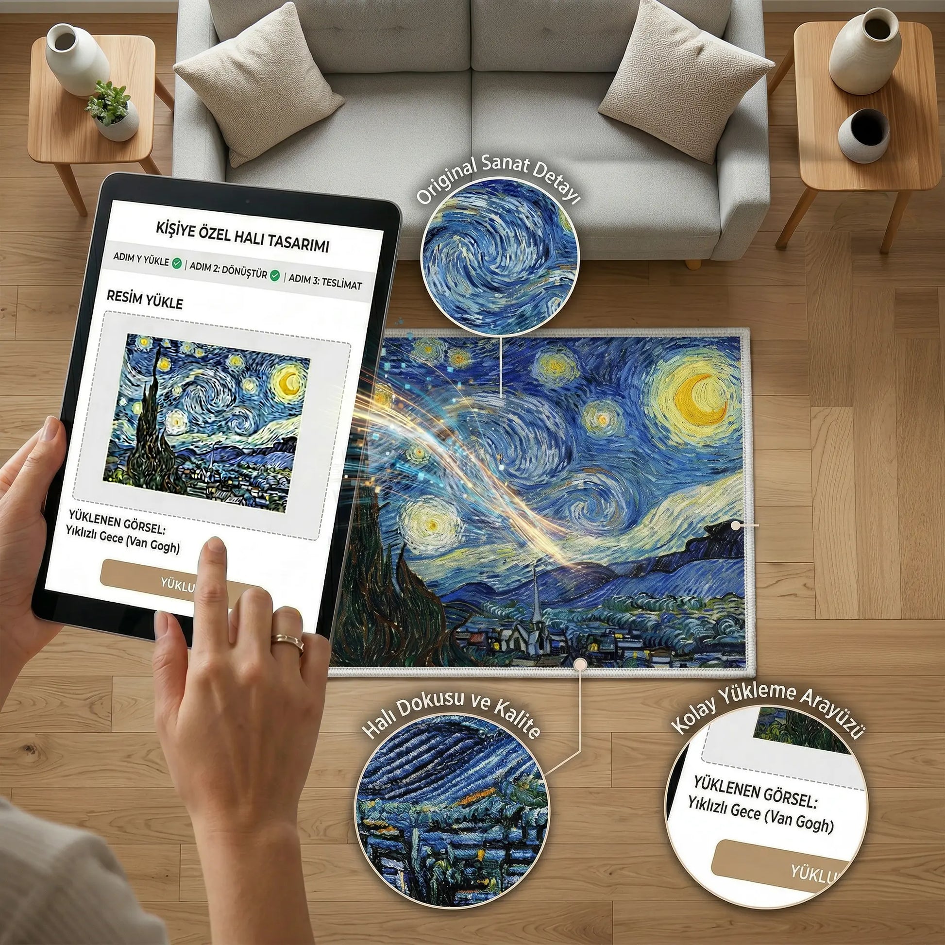 Hayalinizdeki deseni, en sevdiğiniz tabloyu (Van Gogh'un Yıldızlı Gece'si gibi) veya unutulmaz bir anınızı evinizin başköşesine taşımaya ne dersiniz? Yalnızca size ait bir görseli yükleyerek tasarlayabileceğiniz bu eşsiz halı, salonunuza, yatak odanıza veya çalışma alanınıza tamamen kişisel bir dokunuş katar. Yumuşacık dokusu ve yüksek kaliteli baskısıyla adeta zemin üzerinde sergilenen bir sanat eserine dönüşürken, evinize benzersiz bir sıcaklık ve karakter getirecek.